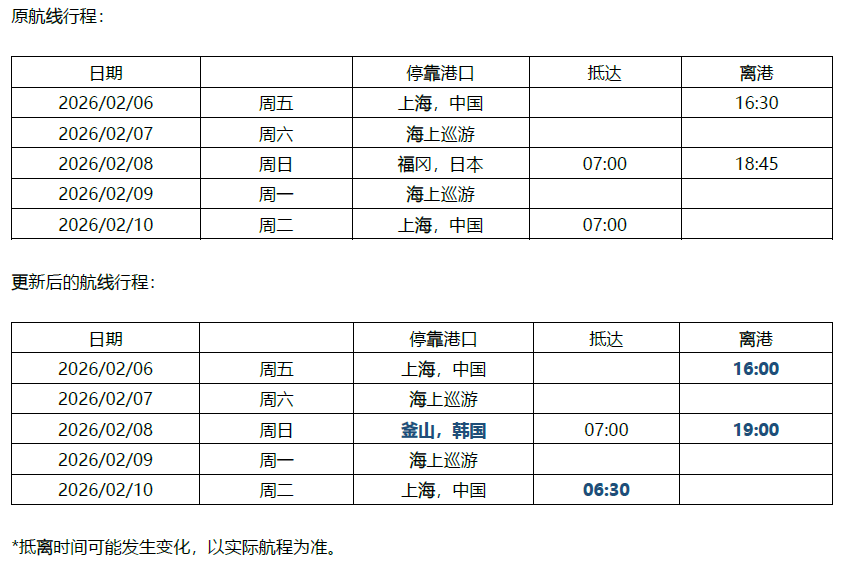 基于近期市场情况及消费者反馈,为持续提升海上度假体验并丰富航线选择,进一步满足消费者对于多元文化探索的需求,皇家加勒比计划对2026年1至4月期间上海母港出发的“海洋光谱号”部分航线进行调整。