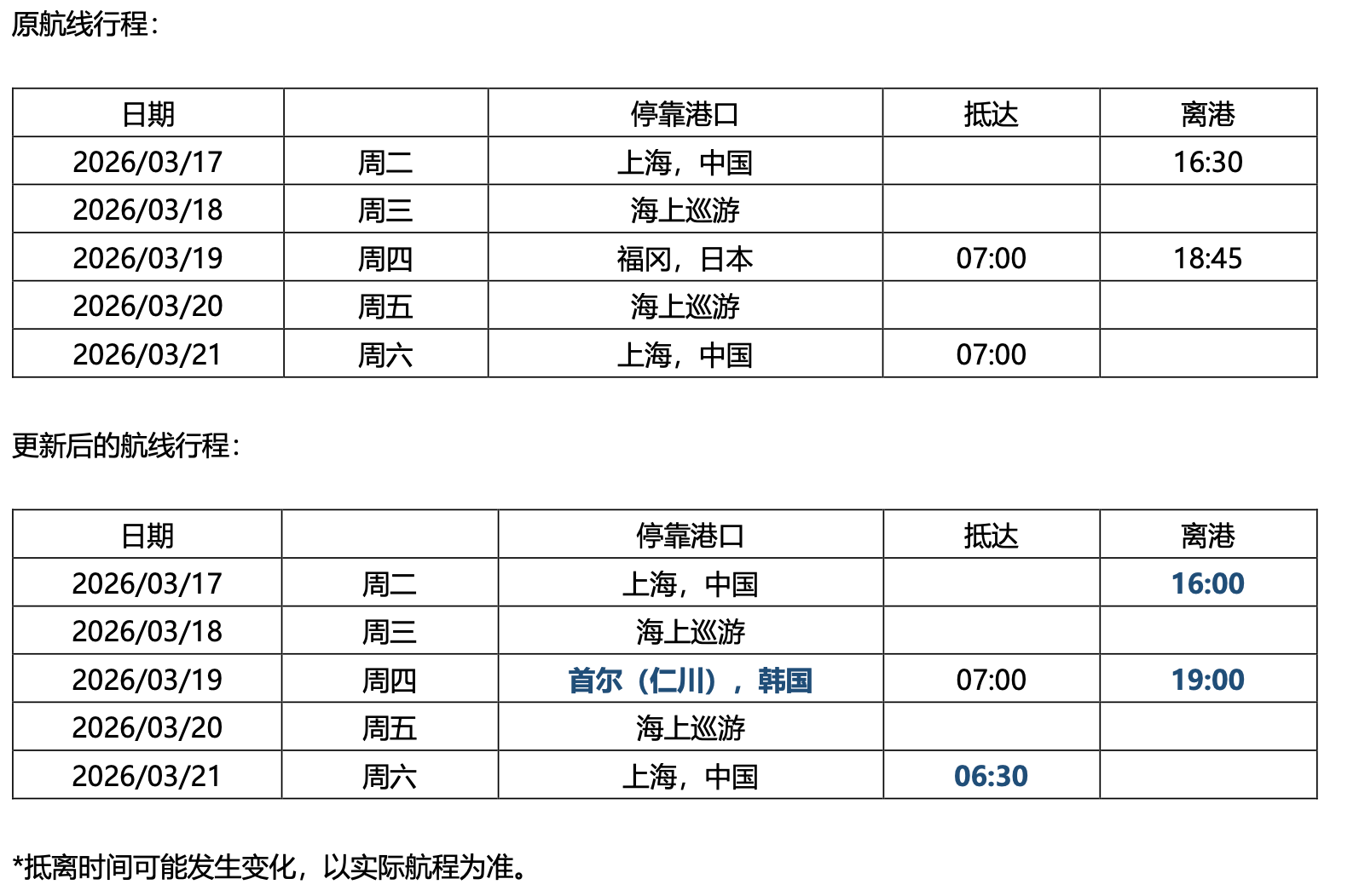 基于近期市场情况及消费者反馈,为持续提升海上度假体验并丰富航线选择,进一步满足消费者对于多元文化探索的需求,皇家加勒比计划对2026年1至4月期间上海母港出发的“海洋光谱号”部分航线进行调整。