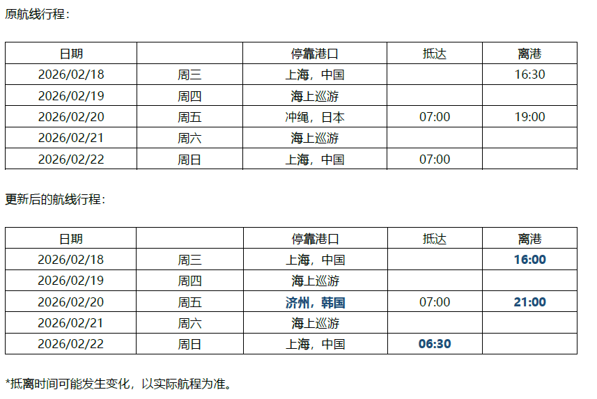基于近期市场情况及消费者反馈,为持续提升海上度假体验并丰富航线选择,进一步满足消费者对于多元文化探索的需求,皇家加勒比计划对2026年1至4月期间上海母港出发的“海洋光谱号”部分航线进行调整。