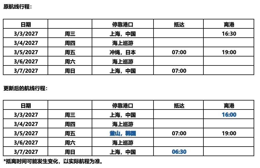 基于近期市场情况及消费者反馈,为持续提升海上度假体验并丰富航线选择,进一步满足消费者对于多元文化探索的需求,皇家加勒比计划对20265月至20274月期间上海母港出发的“海洋光谱号”部分航线进行调整。