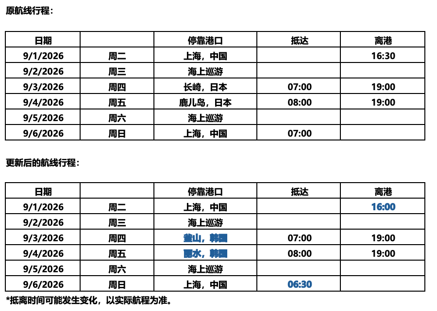 基于近期市场情况及消费者反馈,为持续提升海上度假体验并丰富航线选择,进一步满足消费者对于多元文化探索的需求,皇家加勒比计划对2026年5月至2027年4月期间上海母港出发的“海洋光谱号”部分航线进行调整。