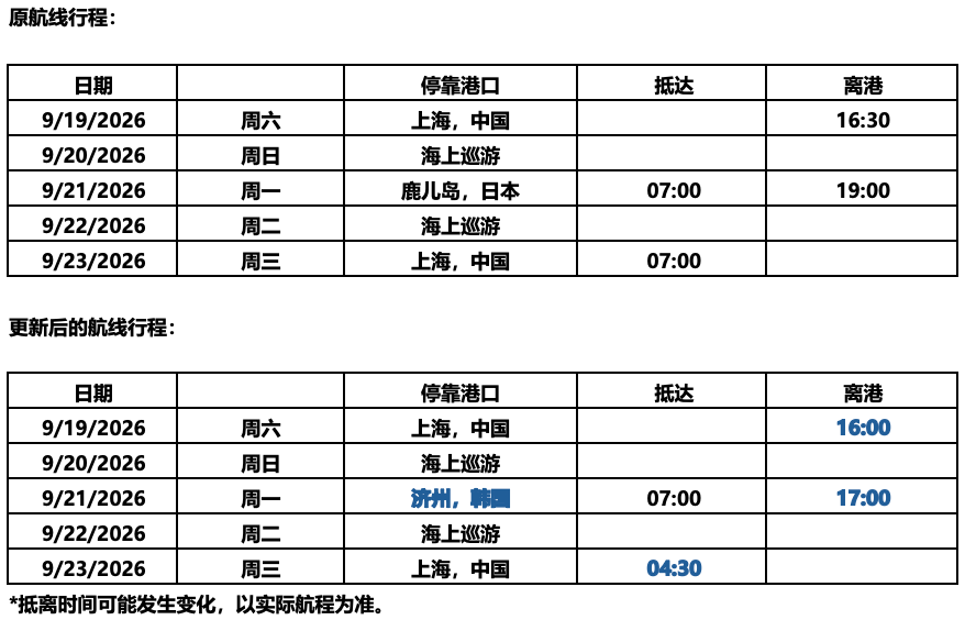 基于近期市场情况及消费者反馈,为持续提升海上度假体验并丰富航线选择,进一步满足消费者对于多元文化探索的需求,皇家加勒比计划对2026年5月至2027年4月期间上海母港出发的“海洋光谱号”部分航线进行调整。